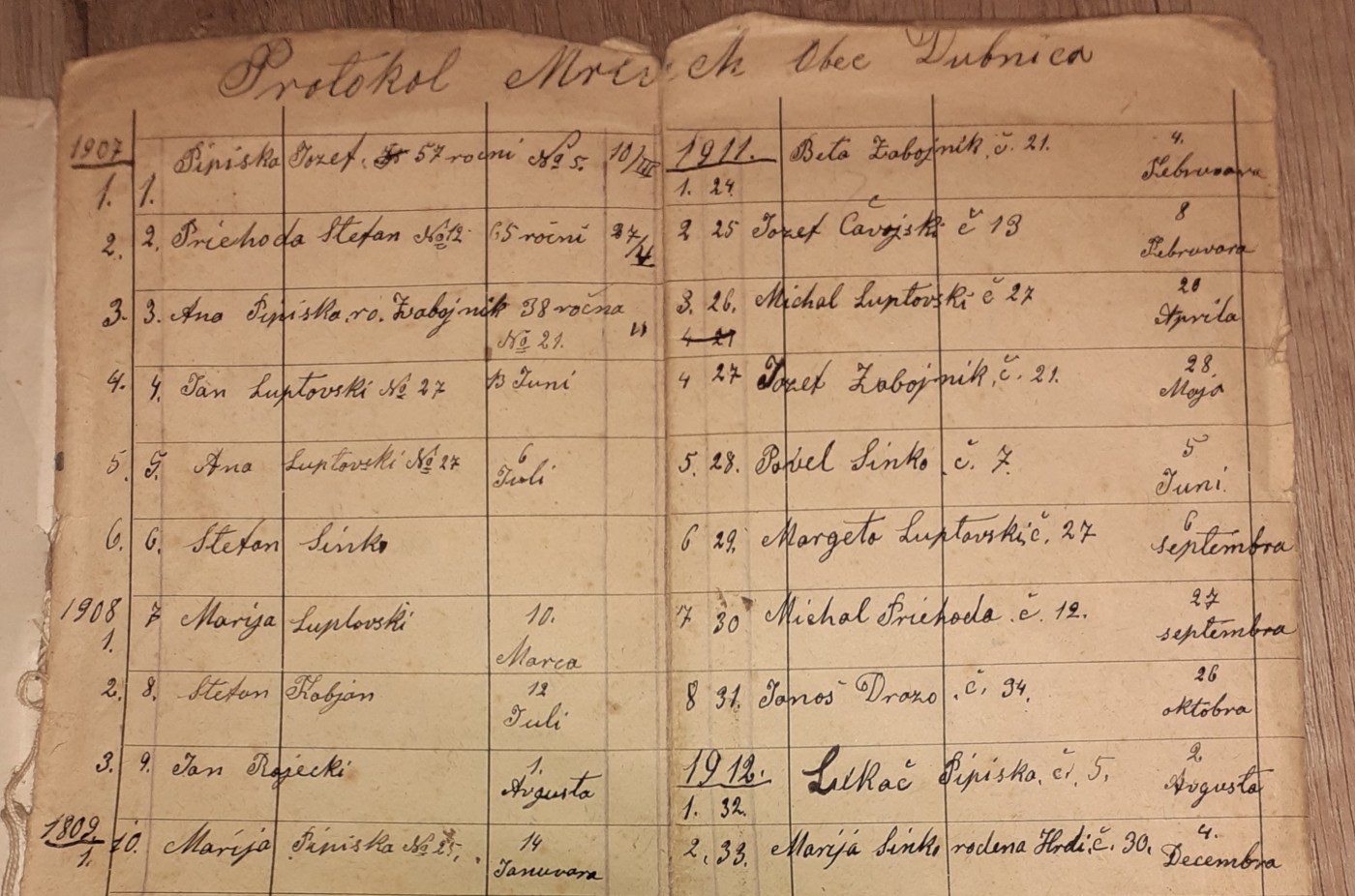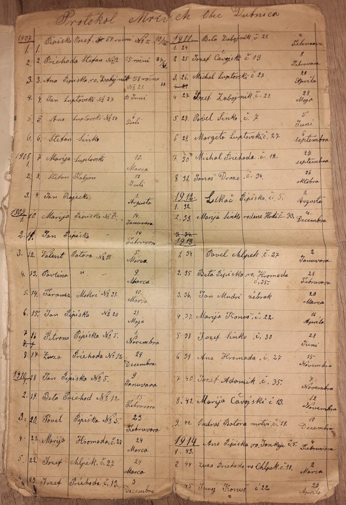 Pri búraní starého Florišeje domu a starej komory v Mišeje dvore sa našli v starej skrini medzi knihami tieto vzácne dokumenty. Je to postupne spisovaný zoznam o zosnulých v obci Dubnica od roku 1907 do roku 1941.