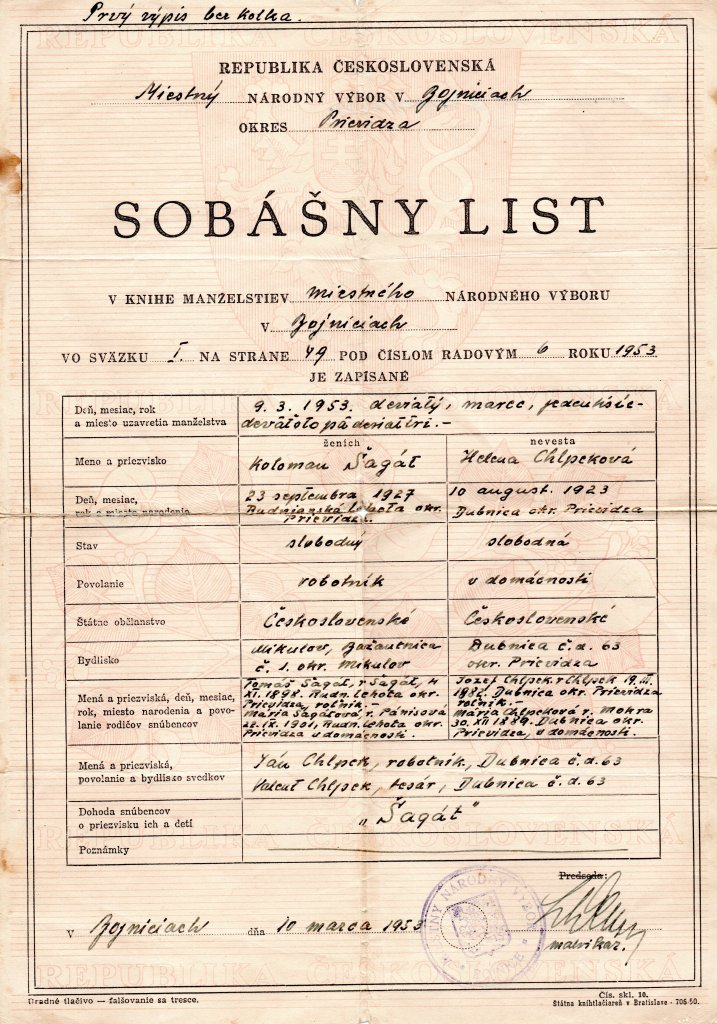Priezvisko Šagát nie je typické dubnické. Koloman Šagát pochádzal z Rudnianskej Lehoty, jeho manželkou bola Helena rod. Chlpeková z dubnickej rodiny s prímenom Majerský.